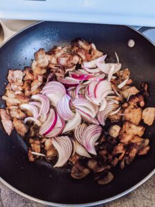 bacon and red onion in pan on stove top