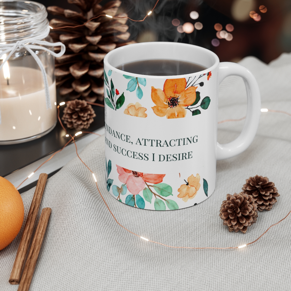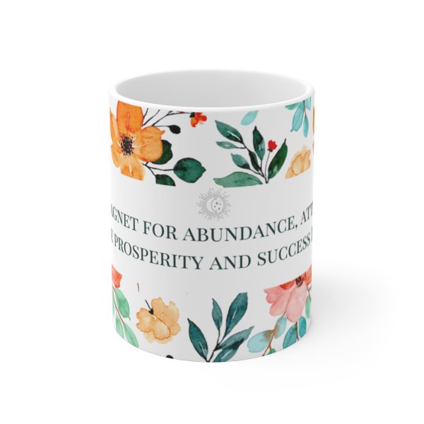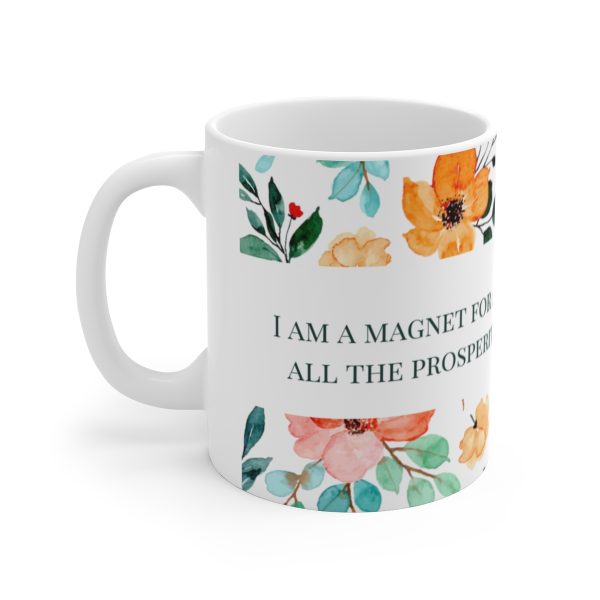 Manifest all of those amazing dreams! The ceramic mug has a beautiful and bold floral backdrop with the inspirational quote, “I am a magnet for abundance, attracting all the prosperity and success I desire.”Perfect for coffee, tea, or any other beverage of choice. This classic white, durable ceramic mug comes in the most popular size, 11 ounces. High-quality sublimation for optimal and crisp image printing.