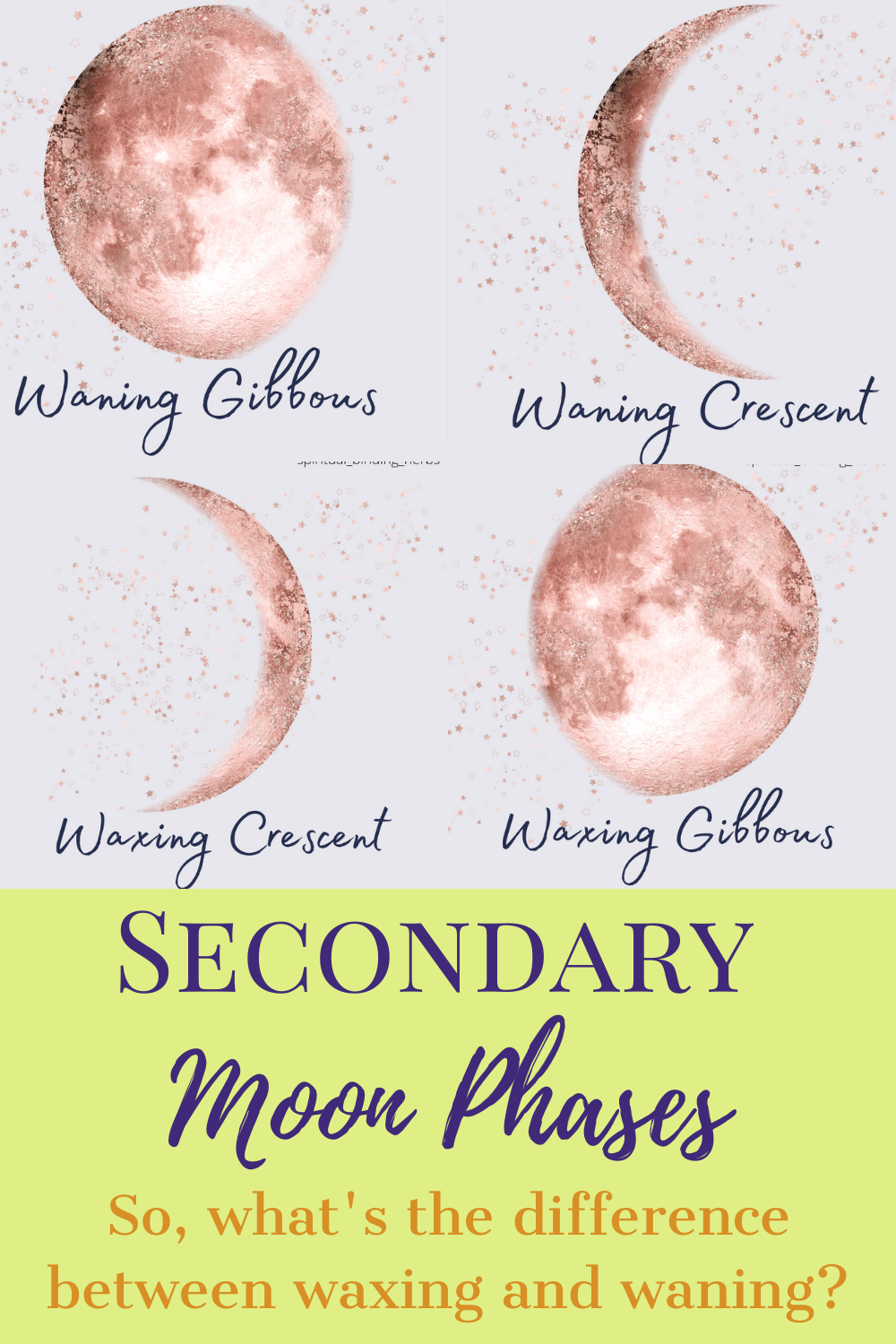 For now, let’s dive back into the secondary Moon phases. These 4 phases are as follows: Waxing Crescent, Waxing Gibbous, Waning Gibbous, and Waning Crescent. Each falls in between each of the primary Moon phases.
