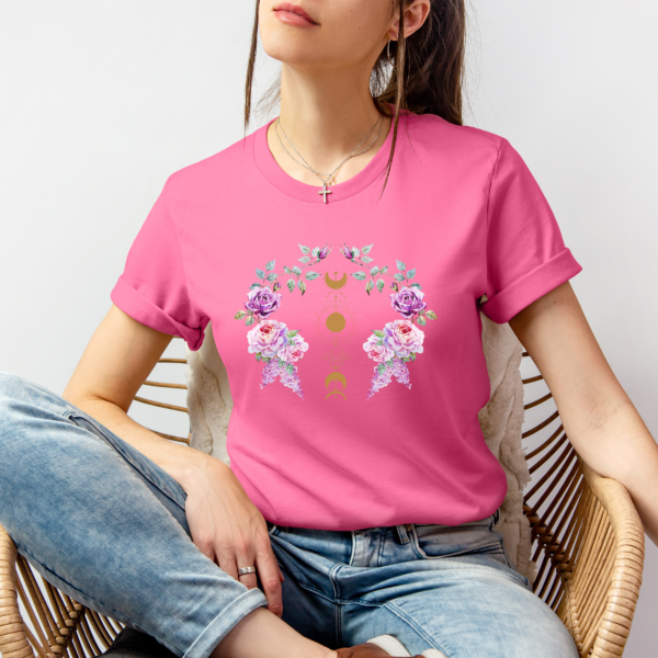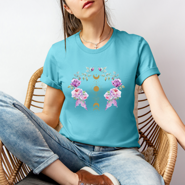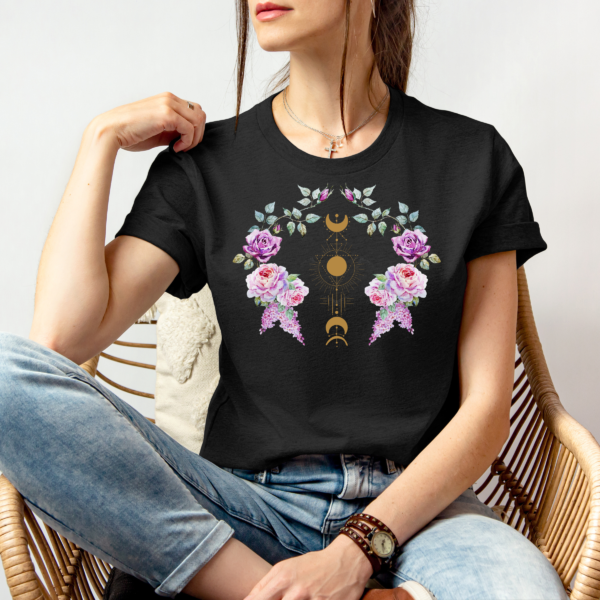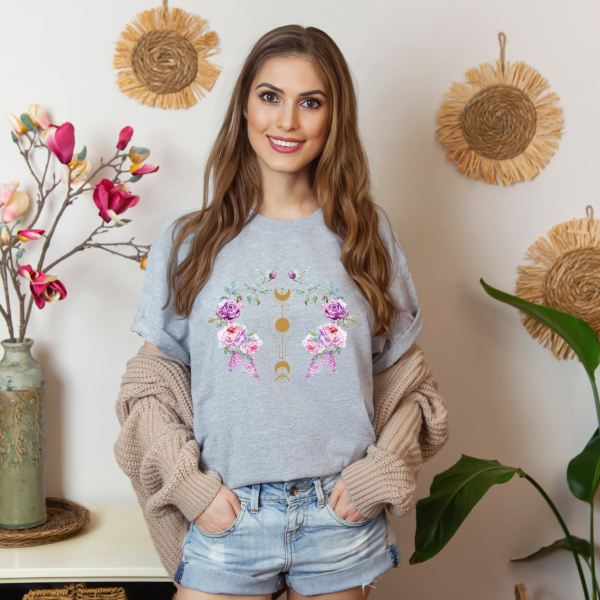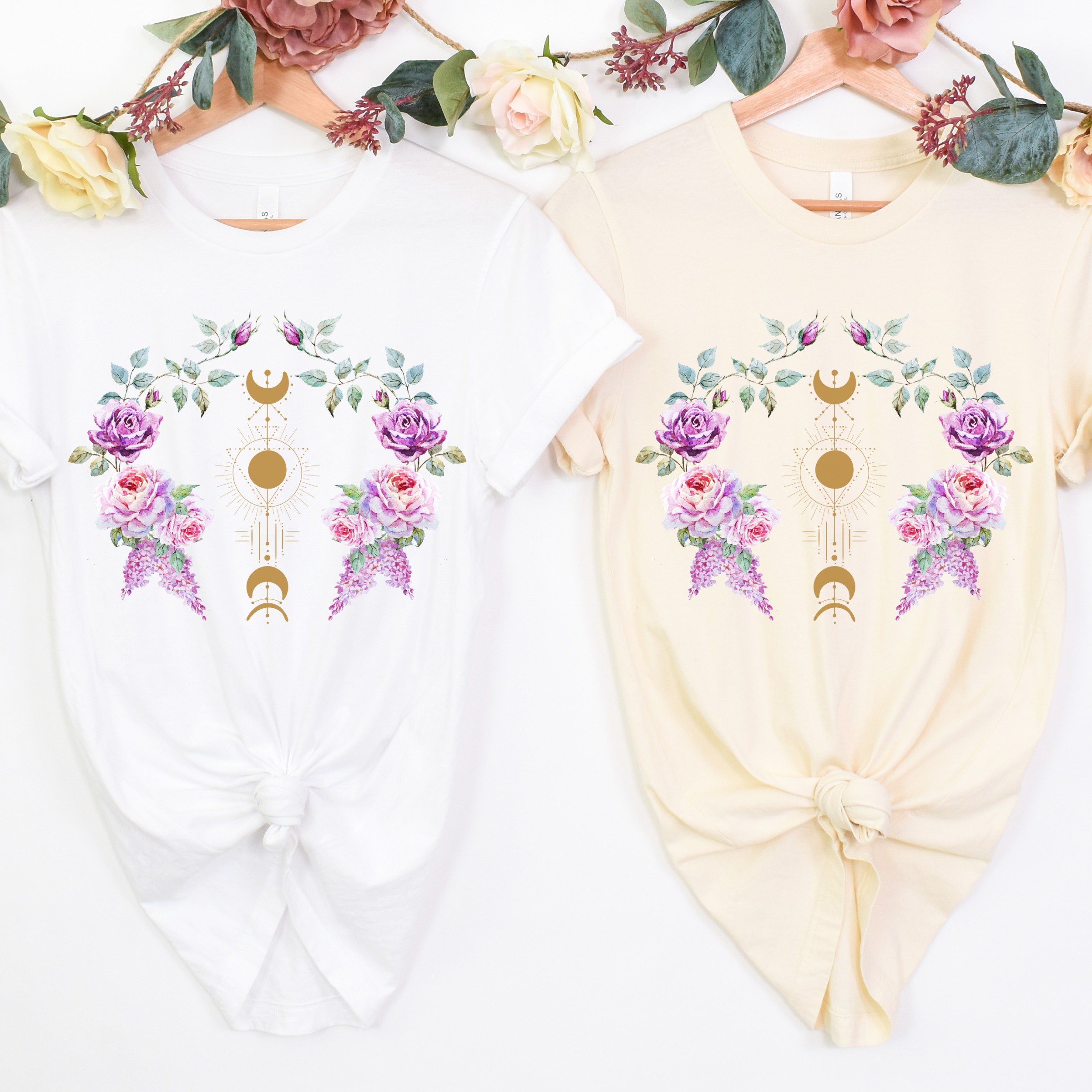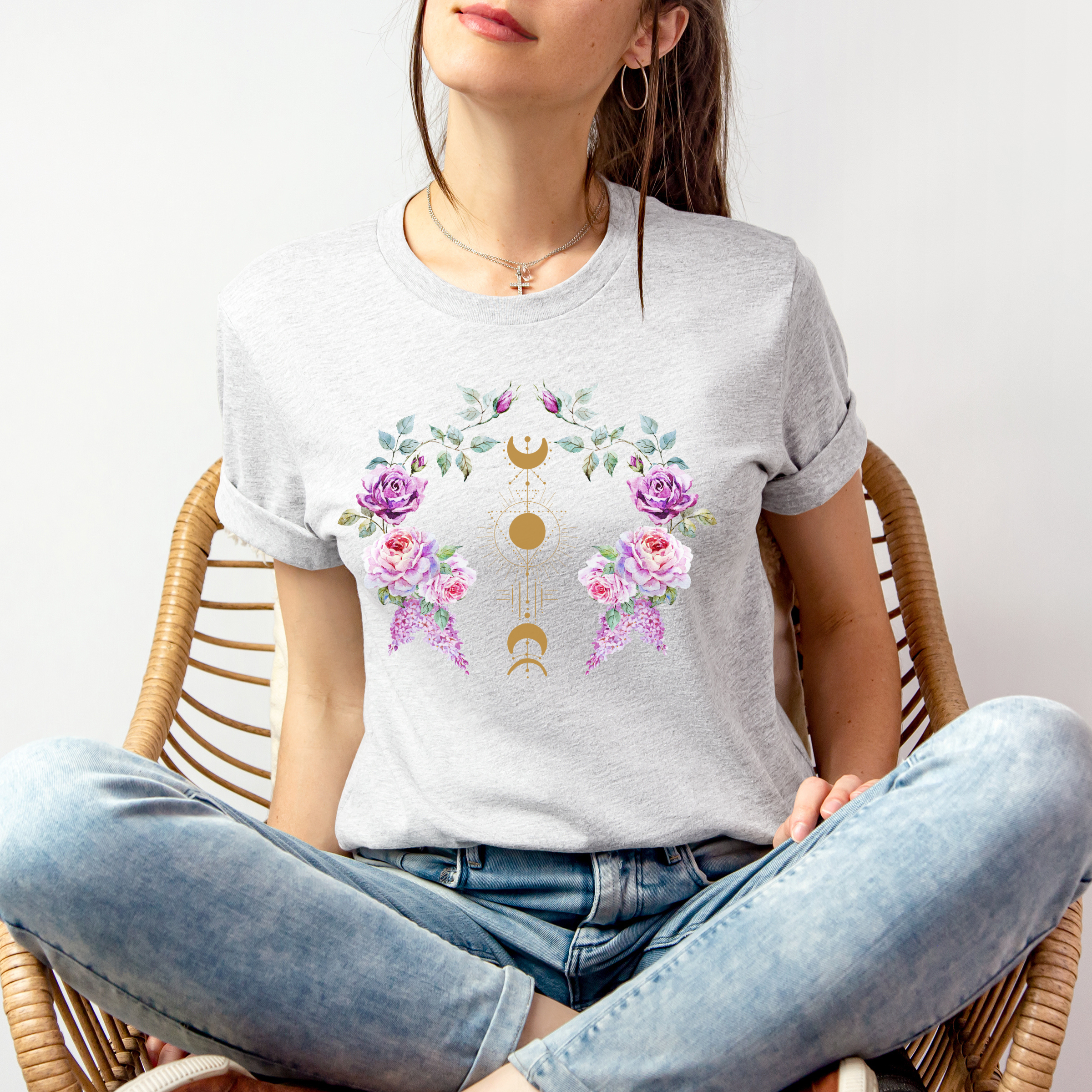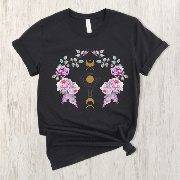Symbolizing intuition, reflection, and the ever-changing nature of existence, the moon phase design invites you to embrace the ebb and flow of life’s rhythms. Paired with the lush purple flowers, which symbolize creativity, mystery, and transformation, this tee becomes more than just apparel—it becomes a wearable work of art with profound meaning.