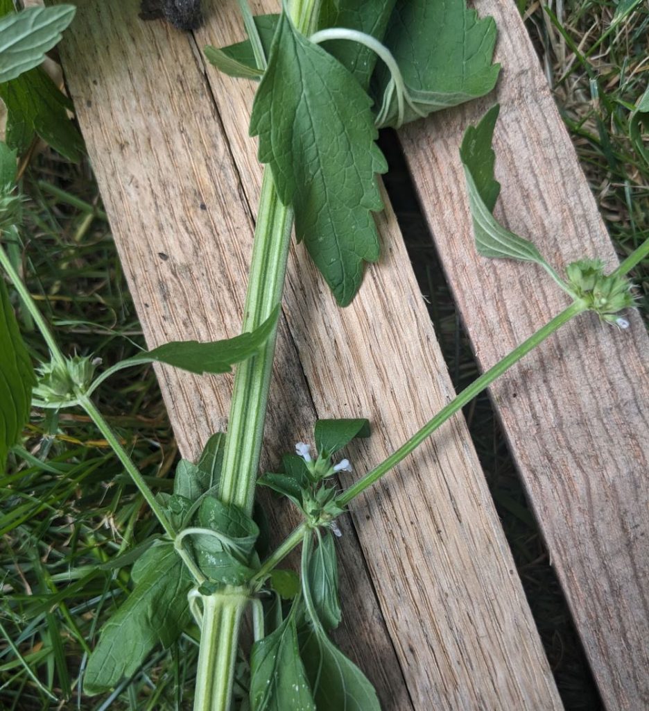 The leaves of Motherwort towards the base will have more pronounced lobes, and the leaf layout will be in a palmately lobed pattern, with 3-5 lobes – versus American Water Horehound, which will display many more lobes. This is one of the ways I now use to help identify between Motherwort and American Water Horehound.